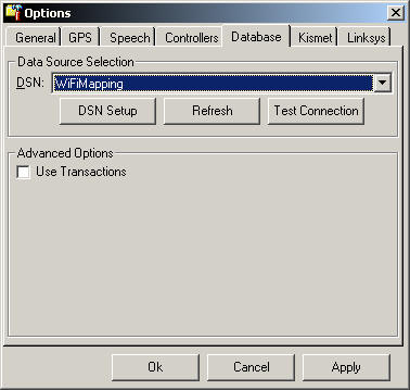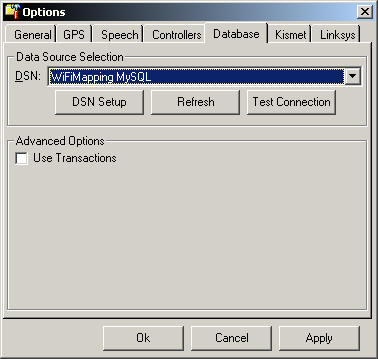 You should be back to the wifi mapper options panel by now. Pull down the DSN drop down and find the DSN you just created. Next be sure to uncheck 'Use Transactions'. MySQL doesn't support or need transactions for optimization.