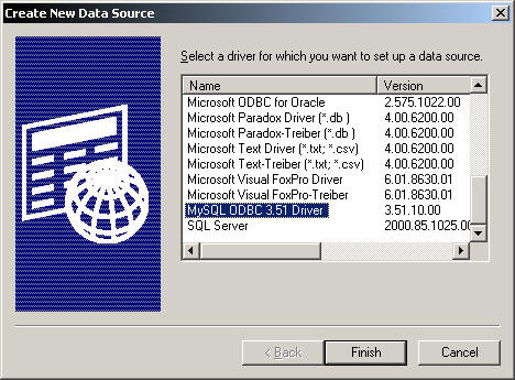 Click finish. Fill in all the appropriate boxes. The Data Source Name can be just about anything. Same with description. The server is the address of your MySQL server. It's probably localhost if it's on your machine. The username and password fields should be self explanatory. For Database, pull down the drop down list and choose the name of the database that you decided to use. When you get done, you should have something like this: