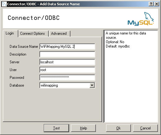 The wifi mapper uses ODBC to connect to it's data source. To connect to a MySQL DB, you need the MySQL ODBC Connector. It can be downloaded here: